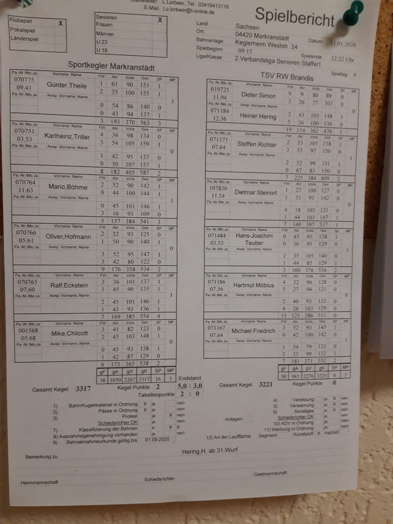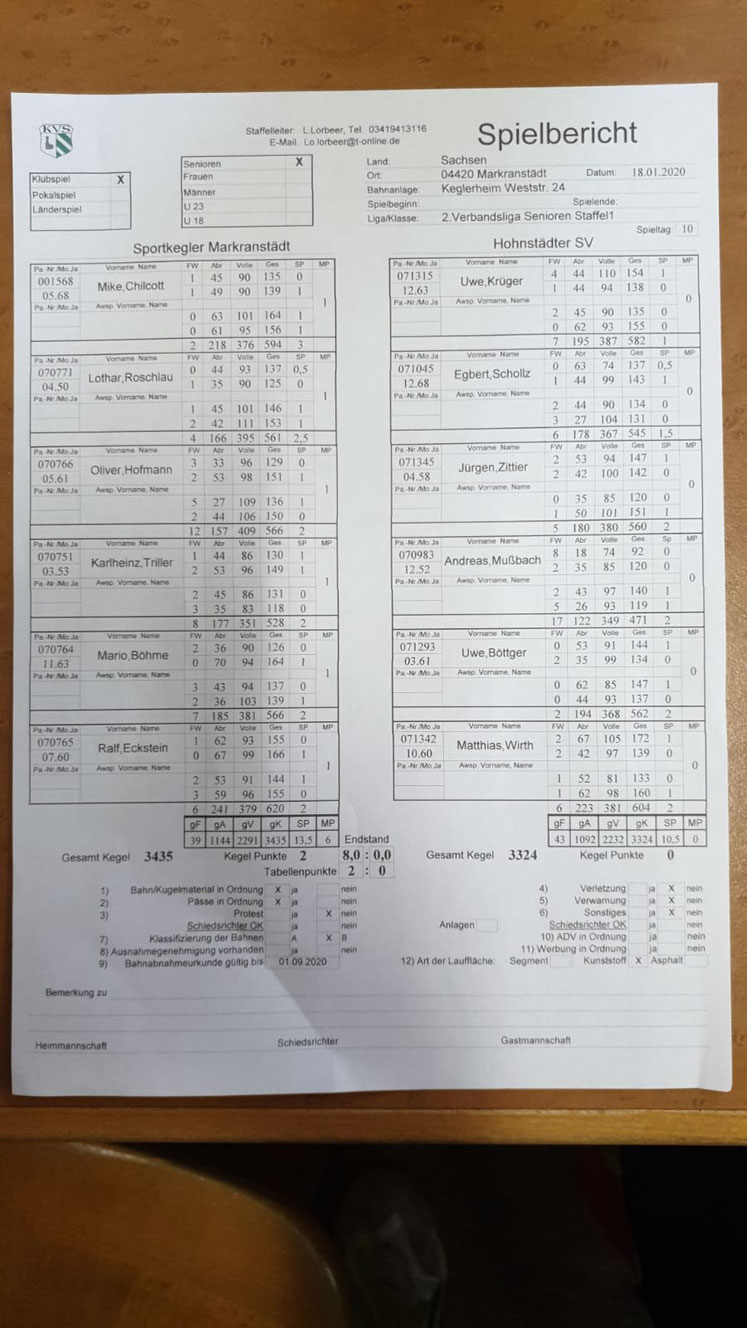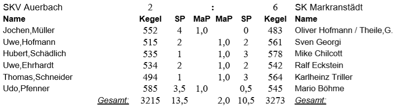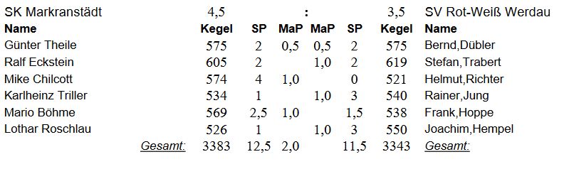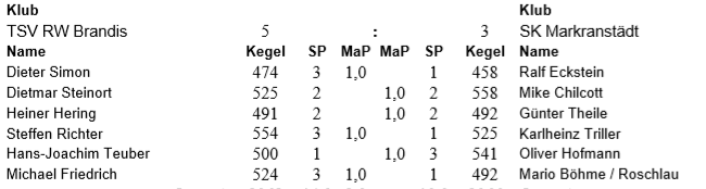 Im Mitteldurchgang spielten Günter Theile gegen Heiner Hering und Karlheinz Triller gegen Steffen Richter. Günter und sein Gegner schenkten sich nichts. Mit 491:492 und 2:2 SP setzte sich Günter durch und holte den 2 MP für den SKM. Karlheinz hatte nicht so ein Glück mit seinem Gegner. Mit 554:525 / 3:1 SP holte sich der Brandiser den 2MP. Nun mussten Oliver Hofmann und Mario Böhme das heiße Eisen aus dem Feuer holen. Olli spielte gegen Hans-Joachim Teuber und Mario gegen Michael Friedrich. Olli holte sich souverän mit 541 Kegel und 3 SP den Mannschaftspunkt, da Hans-Joachim nur 500 Kegel dagegensetze und sich 1 SP sichern konnte. Leider kam auch Mario überhaupt nicht auf den ehemaligen WM-Bahnen zurecht. Er erspielte zusammen mit Lothar Roschlau 492 und 1 SP. Michael erspielte dagegen 524 und 3 SP.
