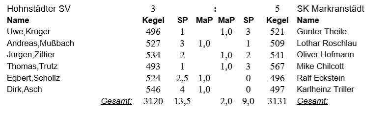 Im Mitteldurchgang waren Oliver Hofmann und Mike Chilcott gefragt. Olli spielte gegen Jürgen Zittier und ergatterte mit 541:534 / 2:2 SP den 2 MP. Mike hatte gegen Thomas Trutz keine Probleme und holte mit 567:493 / 3:1 SP den 3 MP. Mit 88 Kegel Vorsprung hieß es für Ralf Eckstein und Karlheinz Triller Punkte einfahren oder Holz halten. Beide haderten mit der Bahn und so erzielte Ralf gegen Egbert Scholz 496:524 / 1,5:2,5 SP - 2 MP Hohnstädt und beim Duell Karlheinz gegen Dirk Asch sah es nicht besser aus - 497:546 / 0:4 SP- 3 MP für Hohnstädt.